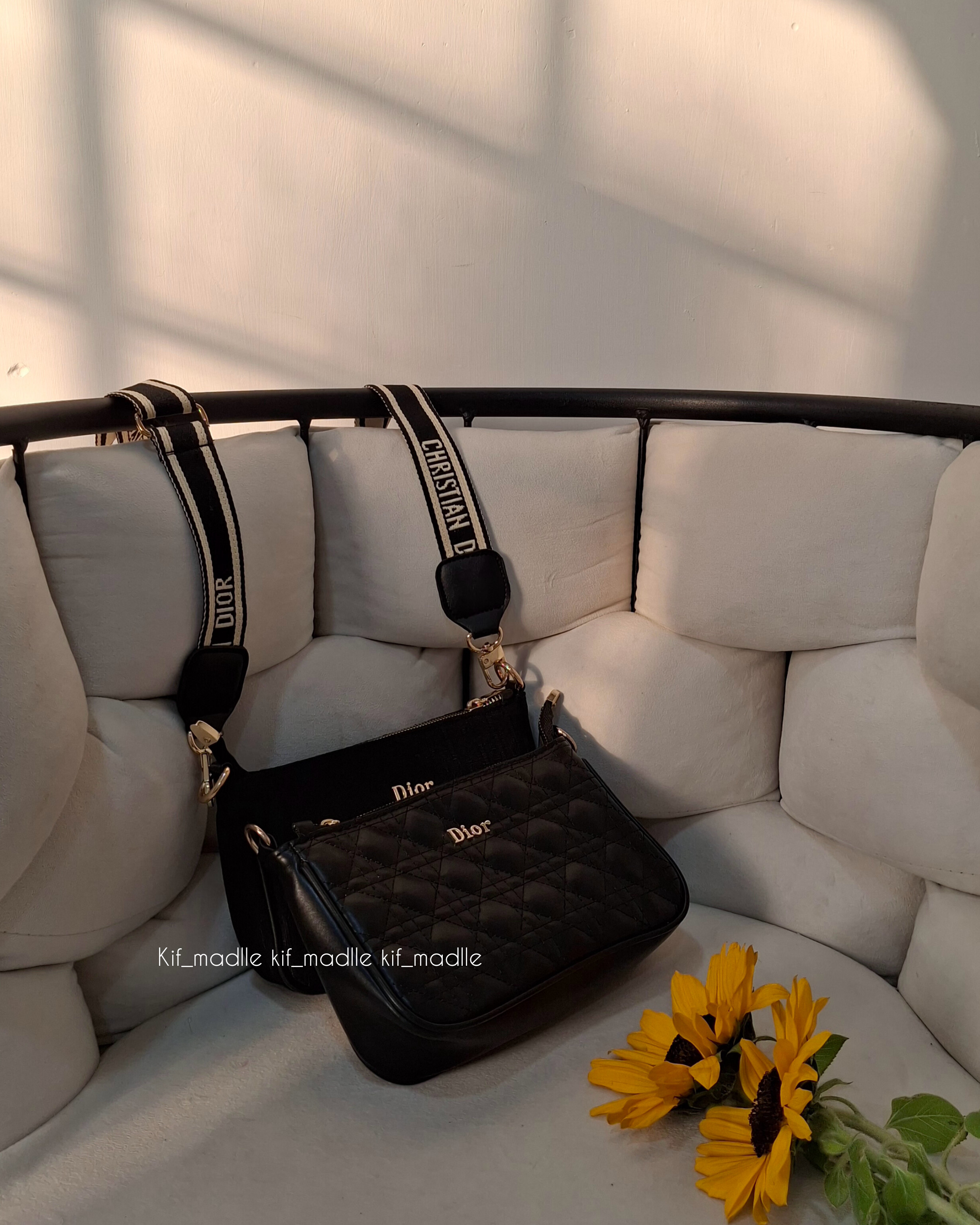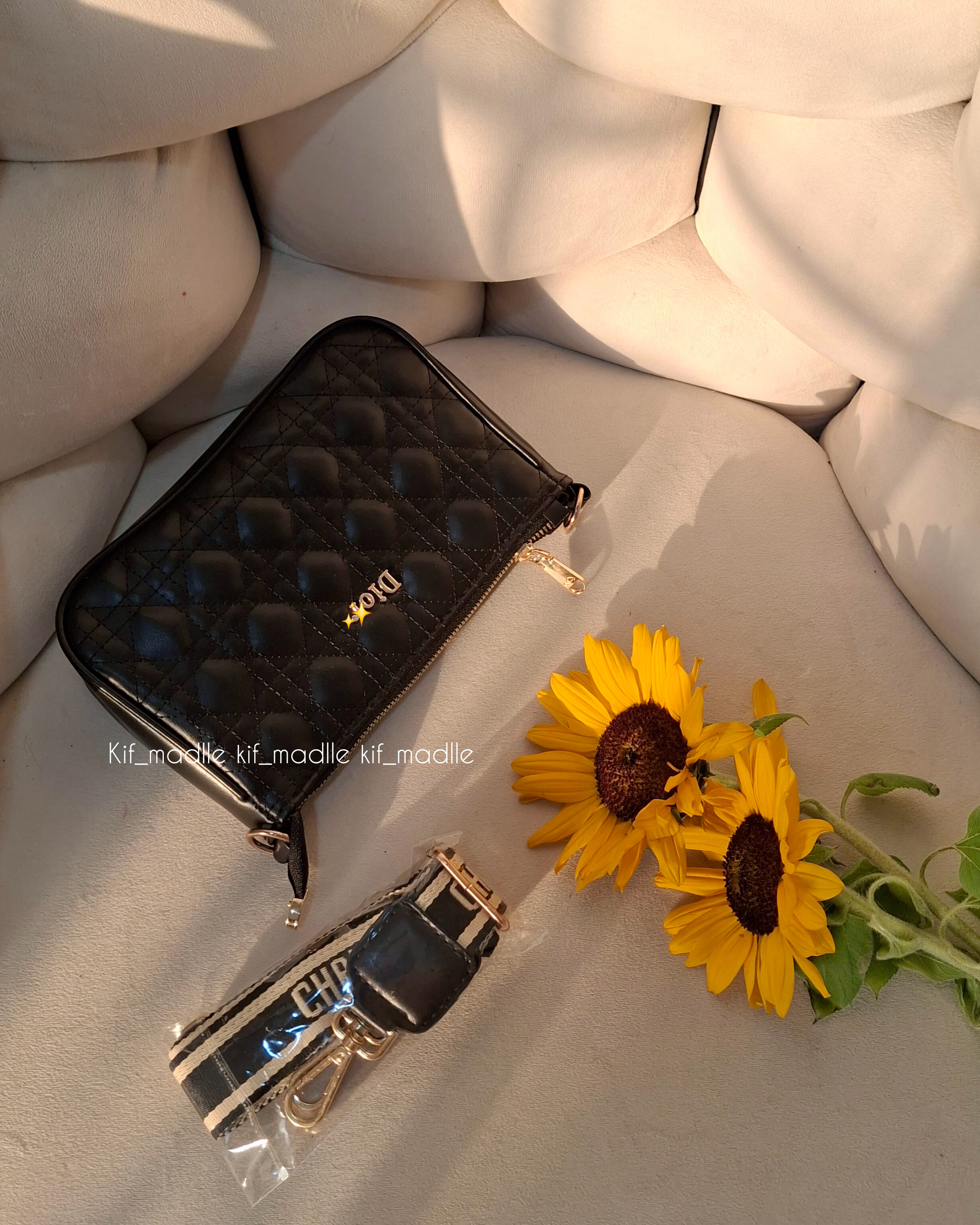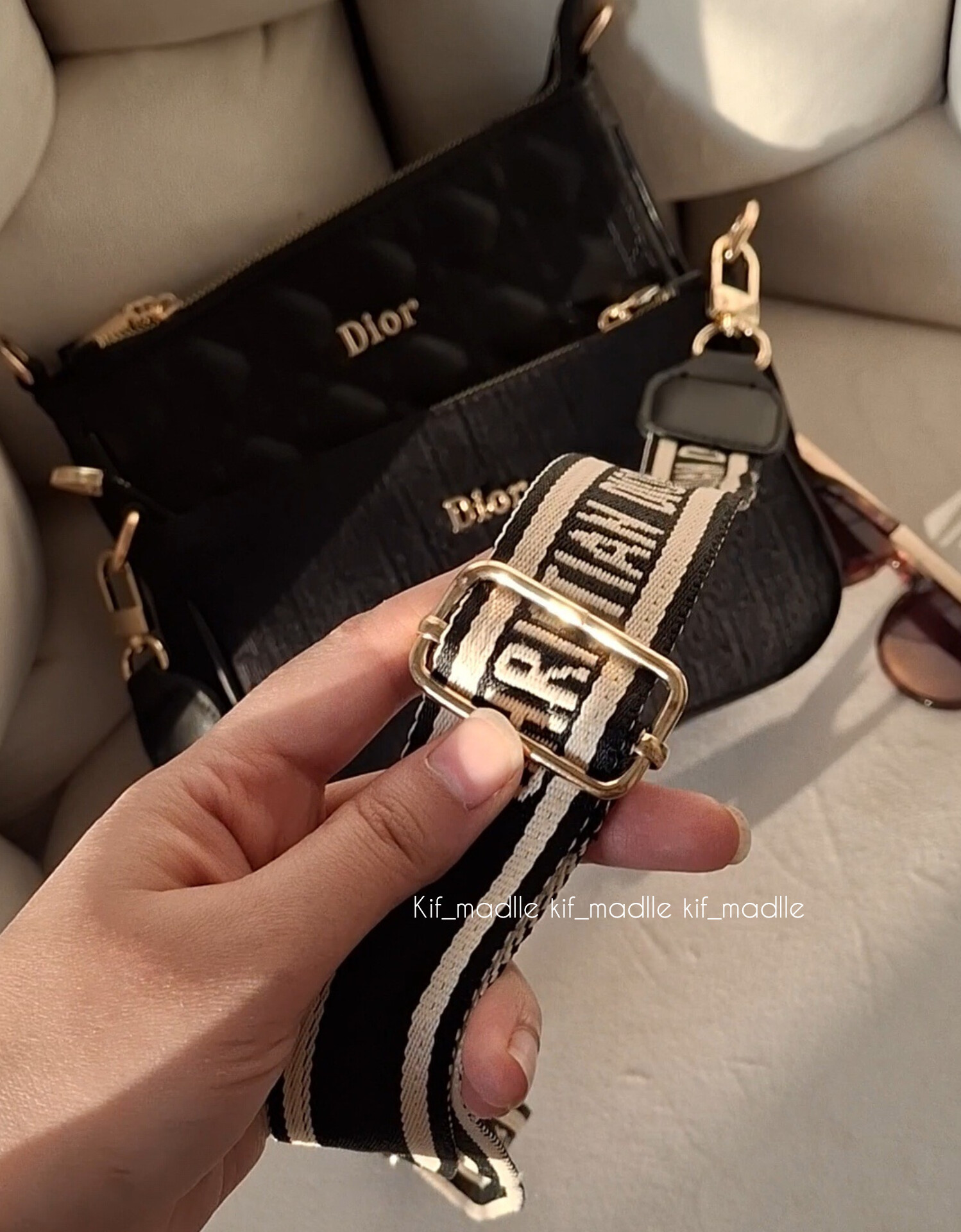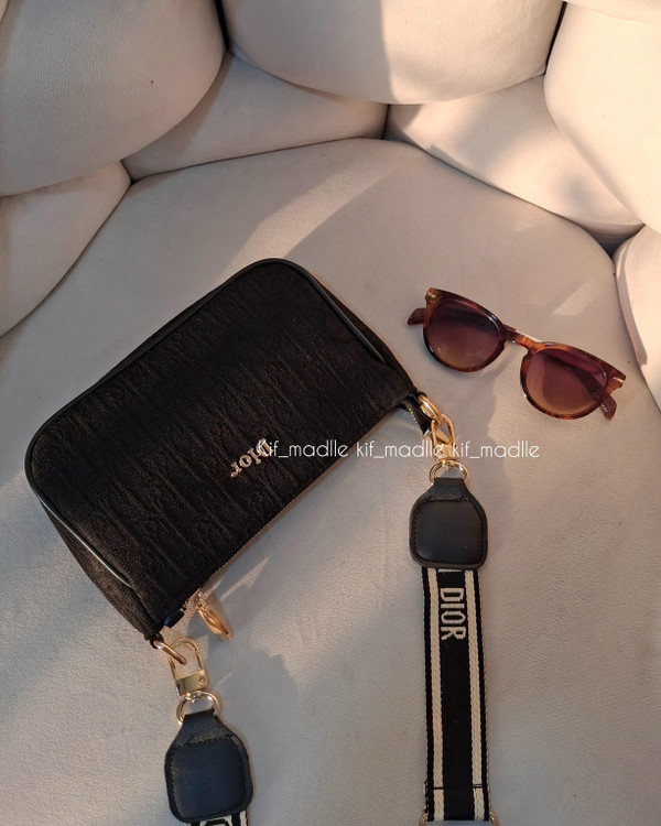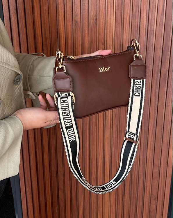 کیف دی.ور وارادتی با دو جنس برجستگی دی.ور و چرم درجه یک. یراق رنگ ثابت با بند حکاکی قابل تنظیم.